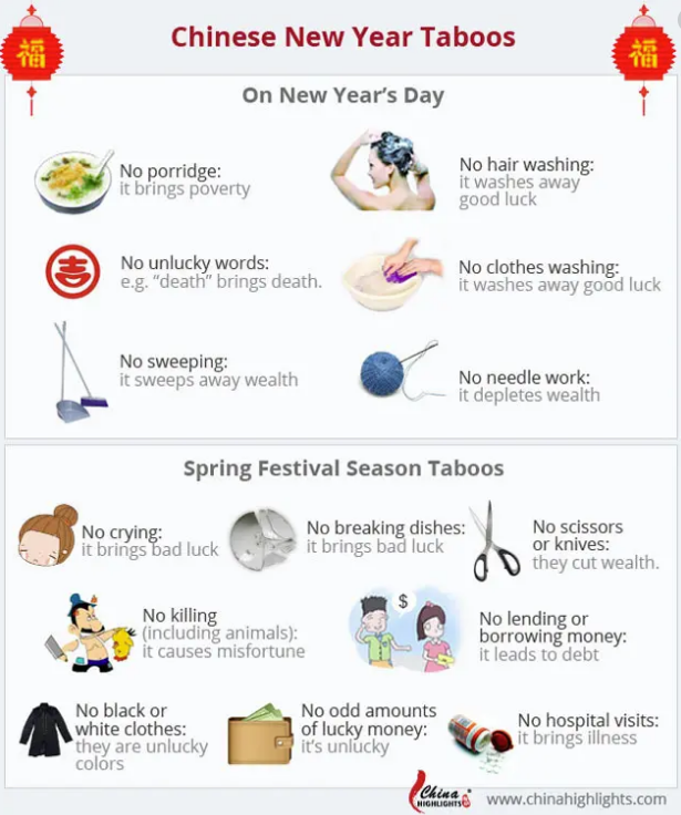 Chinese New Year celebration is about family gatherings and paying respect to the ancestors and Gods. It is a week-long, for some, even month-long celebration. On New Year’s Day. you are not allowed to shower, sweep and bring out the garbage as these actions will “wash” away all the luck for the coming year. And during the first two weeks of the New Year, avoid wearing blue, black and white clothes as these colors symbolize death in the Chinese culture. Instead, wear bright and cheery color for luck and happiness. To ensure your luck for the coming year, do not cut your hair during this month, as it will cut your luck. Try not to take any unnecessary medications as medication means illness will persist during the year. Do not use words that are unlucky and related to death and illness. Be patient with your loved ones and even strangers to avoid arguments. And if you ever break something during Chinese New Year, do not panic! Just say some lucky phrases afterwards to counter the bad luck of breaking things!